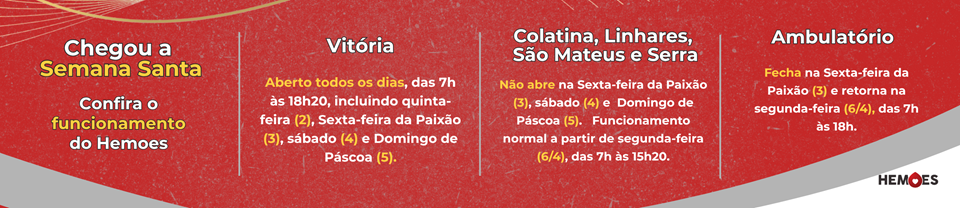 A partir da próxima segunda-feira (10), a Unidade de Coleta da Serra, vinculada ao Centro de Hematologia e Hemoterapia do Espírito Santo (Hemoes), passará a funcionar em novo horá …